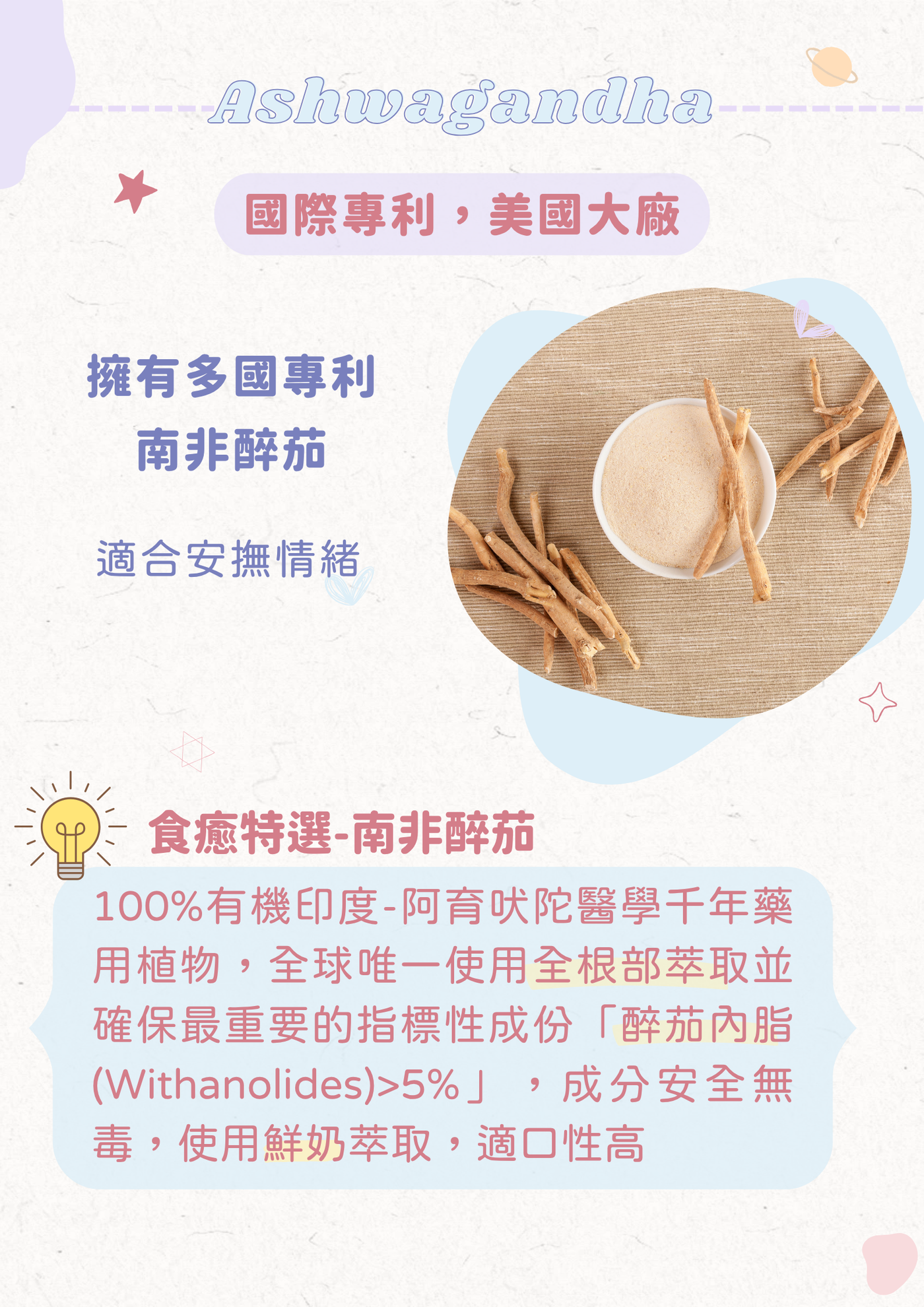 確保最重要的指標性成份「醉茄內脂(Withanolides)>5%」,能安撫情緒,舒緩壓力